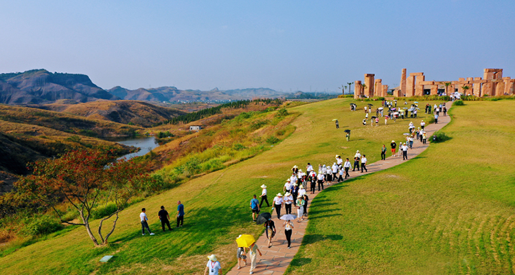 巨石陣由經(jīng)過切割的丹霞原石堆砌而成,門形石陣與水中嬌艷的荷花相互輝映,充滿了神秘而獨(dú)特的美感。在這里,建議穿著純色長裙,穿梭于石拱門之間,利用光影的變幻營造出神秘而迷人的氛圍,隨手一拍都是大片。夏季傍晚時(shí)分,這里還常有民俗表演,火把巡游的熱烈與丹霞夜景的靜謐相結(jié)合,氛圍感直接拉滿。
