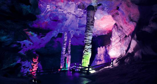 在洞內(nèi)地下河游船上你可置身于一寬度不足10M,但高達(dá)50M以上的峽谷中,而在高處的洞頂,卻是石鐘乳垂吊如林,更若厚厚的云層蓋頂,蔚為壯觀??芍^船在水中行,人在畫(huà)中游。